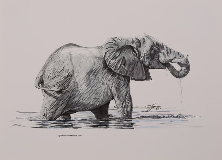 Original sketch of an elephant enjoying a cool drink in black & white-with light blue highlights.