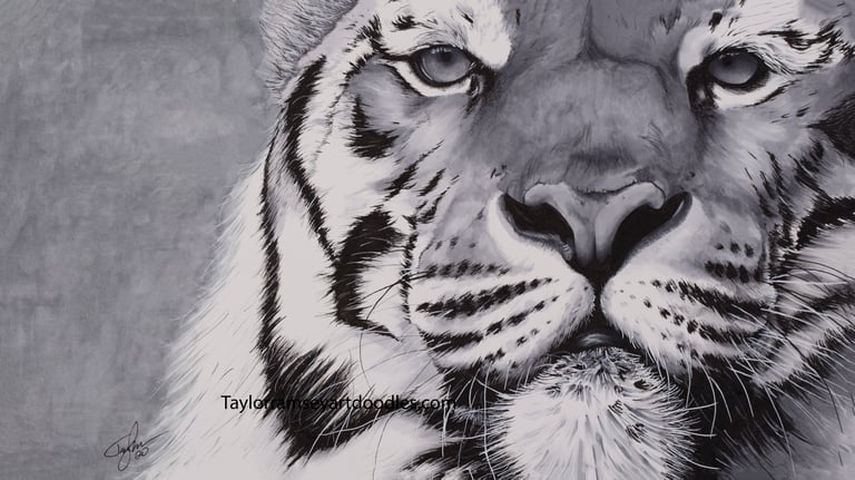 Original black & white drawing in marker of a much closer view of a tiger than is generally recommended!